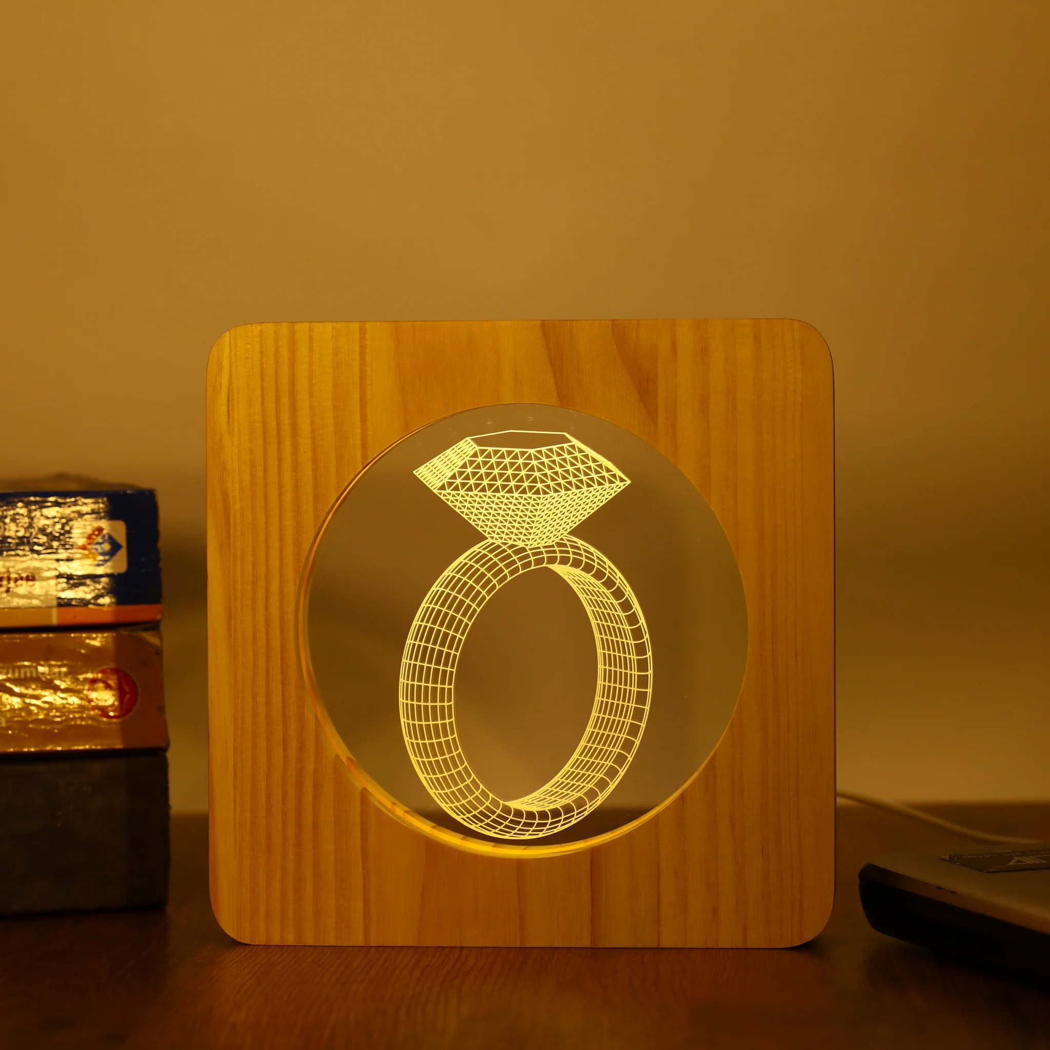 Diamond Ring 3D LED Arylic Wooden Night Light Lamp